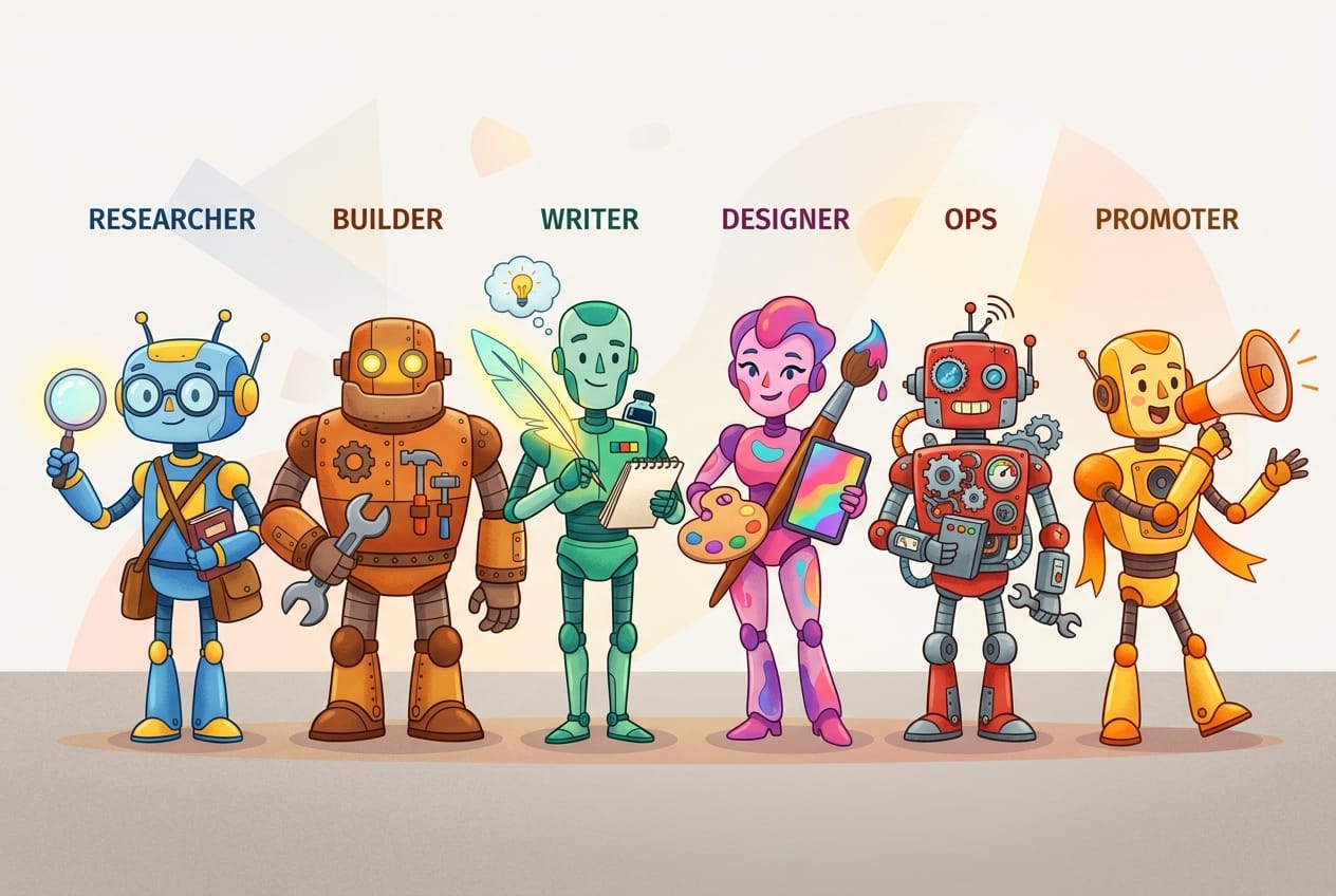 We hebben 6 rollen geïdentificeerd. Ik zeg 'we' want tegenwoordig gebruik ik Claude veel als sparring partner. Er is dus een Claude-instance die mijn sparring partner en coach is, die heb ik niet in het team opgenomen, hij is meer zoals een externe adviseur.